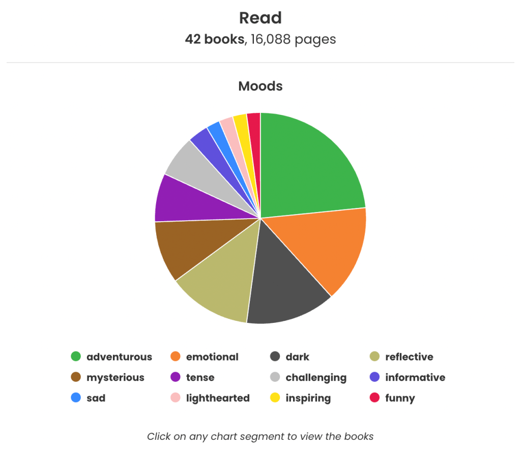 Here is a cute pie chart of the main moods I assigned to the books I read.You can see that I have a preference for unique, emotional, dark and reflective stores that make me think more about the story itself or the world around me.
