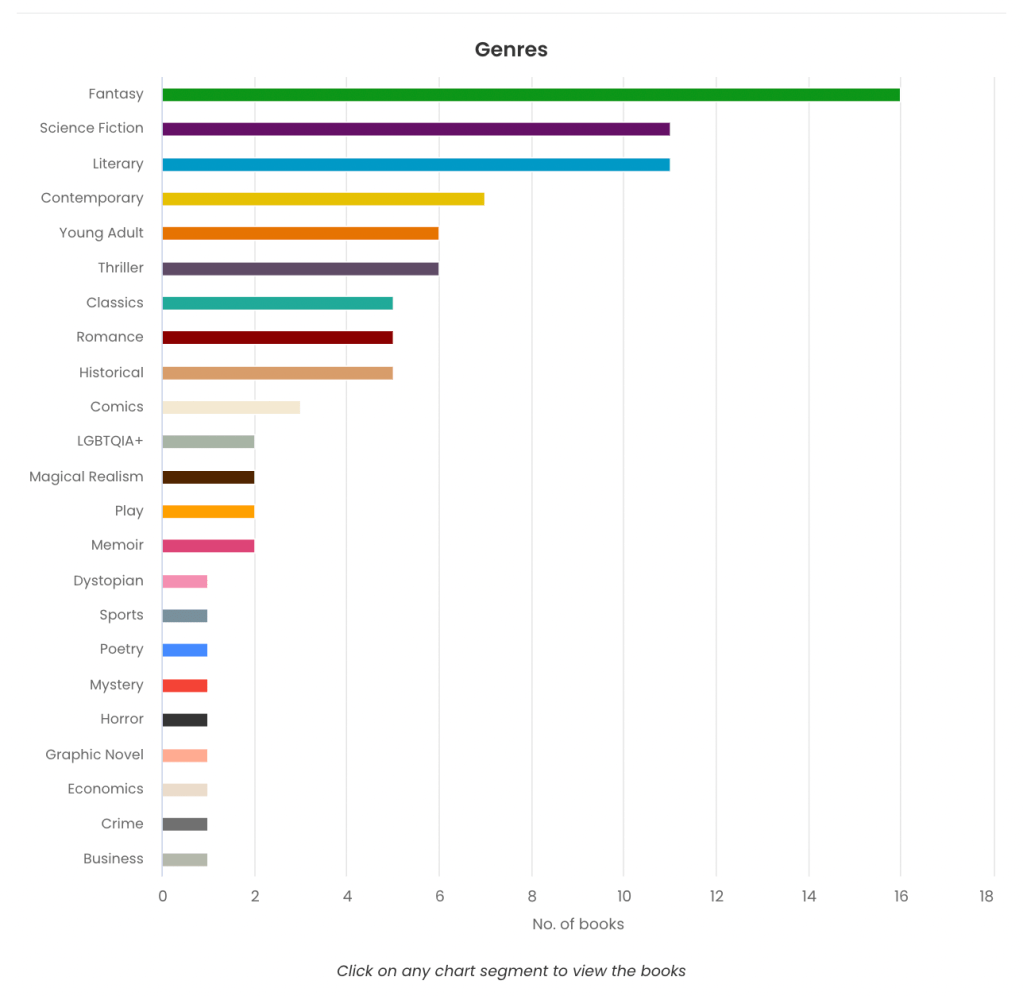 Onto genre! I’ll be honest, this was a little surprising and yet fun to see. I didn’t realise I was so interested in Thrillers and Sci-Fi, but it was cool to see. I also liked being introduced to new genres such as Magical Realism, so I’ll look for more books like that in future as well.