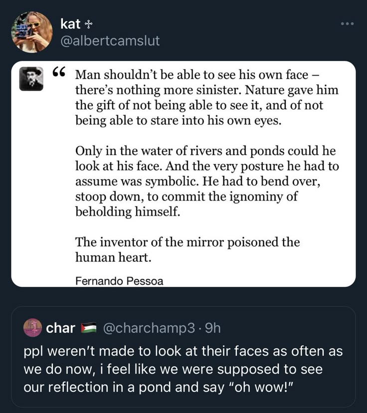 Today during my daily scroll, I came across a video in which a woman was discussing how humans are really not meant to be able to see themselves. I’ve come across this sentiment before, with a comment about how Narcissus is the first and most prominent example of what will happen when we are given our reflection to stare at.