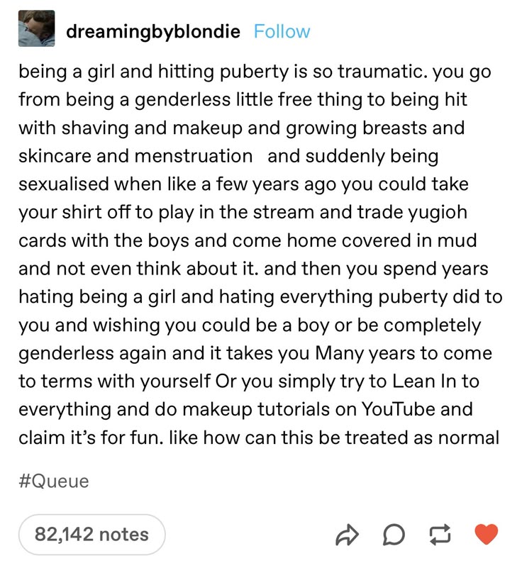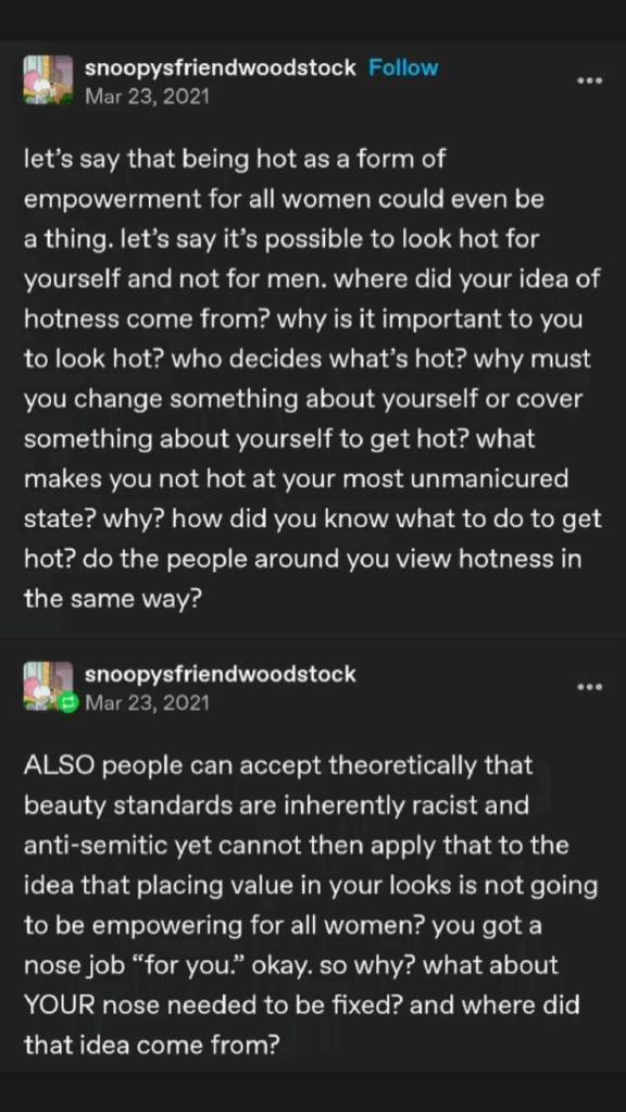 This also brings to mind another post which has altered my brain chemistry. When discussing ‘beauty’ there are so many different standards and conceptions of beauty. Different cultures have their own standards, and there are different rituals, practises and traditions that become normalised as a result. For example, in Australia, having the ‘sunkissed’ look is everything, even if it means risking skin cancer, while skin bleaching is common in places like India.
