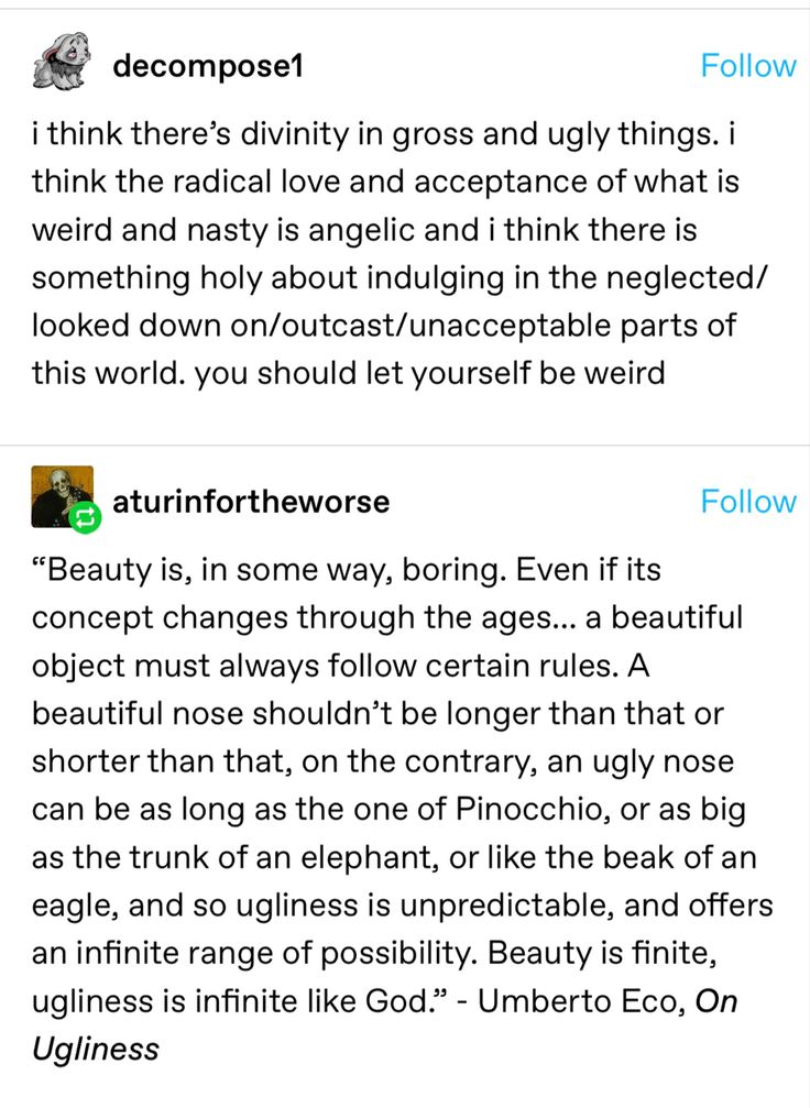 It is also frustrating because beauty is not nearly the most important thing to aspire too. That isn’t to say we shouldn’t be able to look or feel good. But for something so subjective, it cannot be our only focus. Where is the desire for education, wisdom, love, kindness, joy, fulfilment? Why do we place such importance on something that—while nice—does not truly help anyone around us, or make the world a better place? This is not a criticism of beauty, but of our obsession with it above all else.