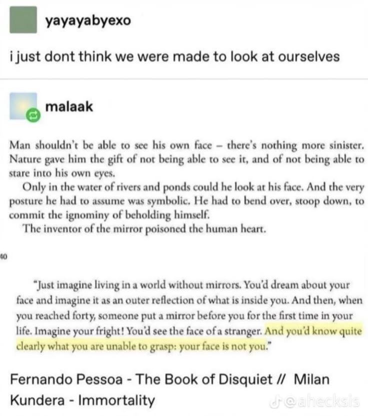 Before mirrors, we could only see ourselves in pools, through rippled reflections, or metal that would still distort our appearance. Perhaps we might hear of our appearance from others, but we could never be so obsessed before.