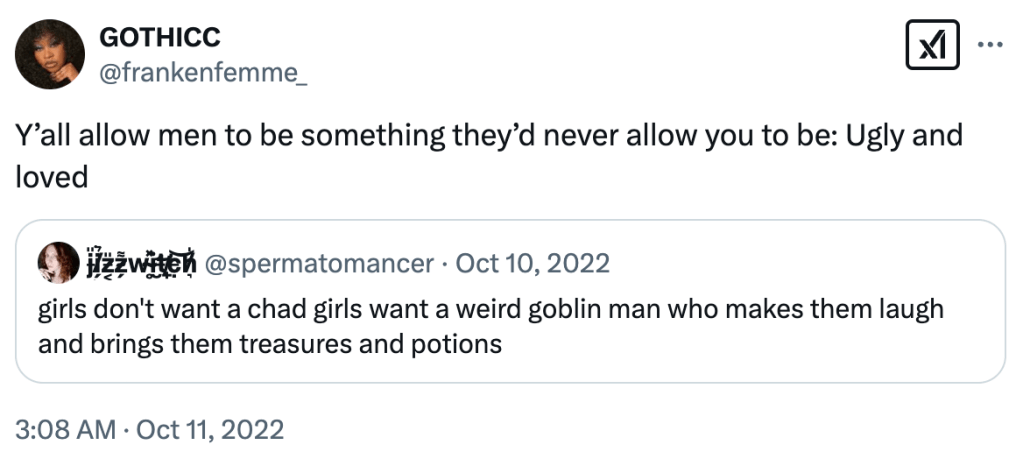 “Y’all allow men to be something they’d never allow you to be: Ugly and loved” —What a bar.