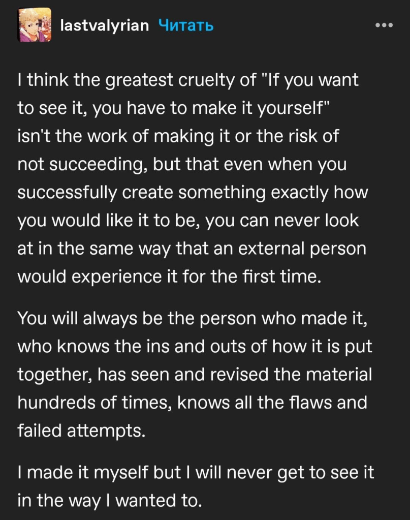One of the sayings which has genuinely haunted me for years is ‘wherever you go, there you are’, and this is unbelievably true when it comes to your art. This post brought up the feelings again, and I figured that I’d try to articulate some of them—following my theme of writing more openly and frequently.