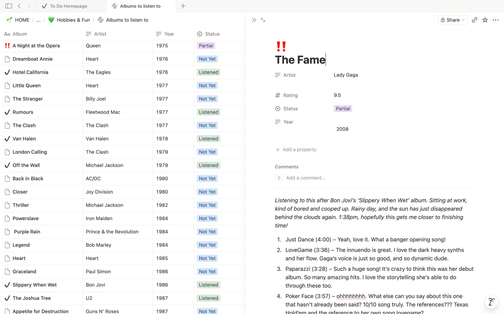 This is a hobby that is meant to keep you busy, and your mind engaged in something that is not being sad! The most important thing to do here is record it! Keep track of the times you do this, rank them, and keep a record. I use Notion, and I have a page set up like this with a database table. I’ve got a column for the album names, the artist, year it was released and my status for listening to the album.